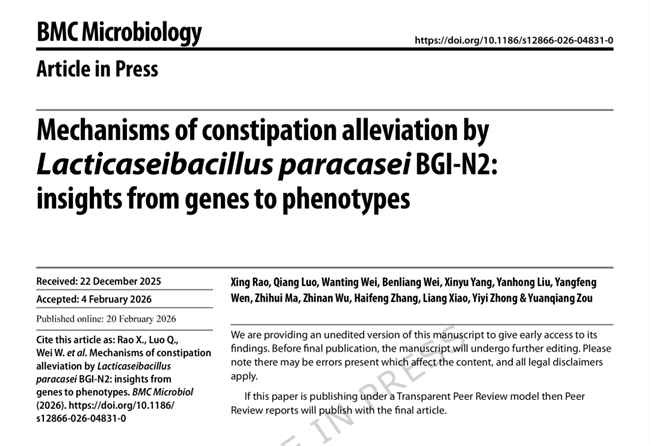 [1] Rao, X., Luo, Q., Wei, W. et al. Mechanisms of constipation alleviation by Lacticaseibacillus paracasei BGI-N2: insights from genes to phenotypes. BMC Microbiol (2026). https://doi.org/10.1186/s12866-026-04831-0