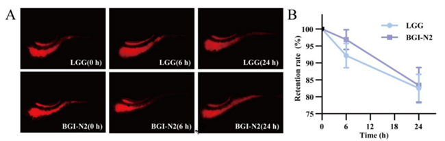 BGI-N2携带mapA、lspA等多个黏附相关基因,还拥有应激响应等肠道适应相关基因,能通过结合肠道粘蛋白、适应肠道环境实现稳定定植。在斑马鱼模型中,BGI-N2的24小时肠道滞留率高达83.37%,为其长效缓解便秘提供了重要保障。