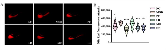 为验证BGI-N2的体内便秘缓解效果,华大团队选用斑马鱼作为实验模型,通过构建斑马鱼便秘模型,设置低、中、高三个剂量的BGI-N2干预组,同时设置正常对照、模型对照和阳性药对照,通过尼罗红荧光标记法检测肠道内容物滞留情况,评估肠道动力。