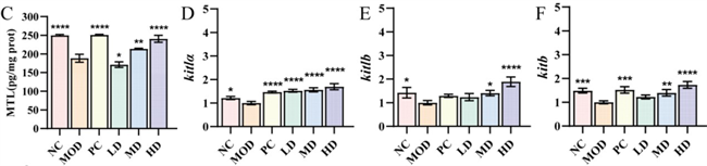 BGI-N2能显著上调kitla、kitlb、kitb基因的表达,促进“起搏细胞”的发育和功能维持。同时还能提升斑马鱼体内胃动素水平,胃动素作为经典的促动力激素,能直接刺激肠平滑肌收缩,双重作用下筑牢肠道的动力起搏系统。