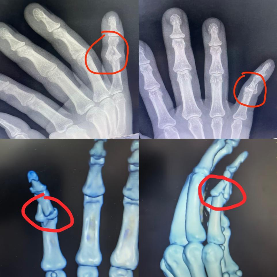 近日,吴先生骑车时不慎摔倒,右手重重着地,当即出现剧烈疼痛、活动受限。他紧急前往附近医院检查,诊断为右小指中间节指骨Pilon骨折,骨折块竟达6块,且已损伤关节面,属于复杂难治性骨折。